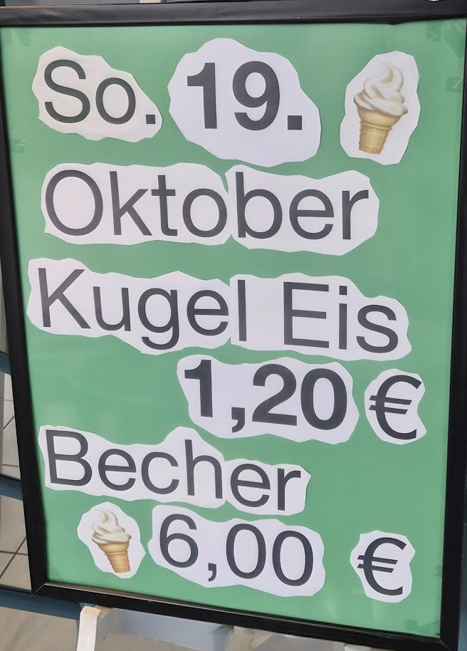 Am 19.10.2025 gehen wir wieder in den Winterschlaf. Eiskugeln und Becher wieder zum Sonderpreis solange der Vorrat reicht.